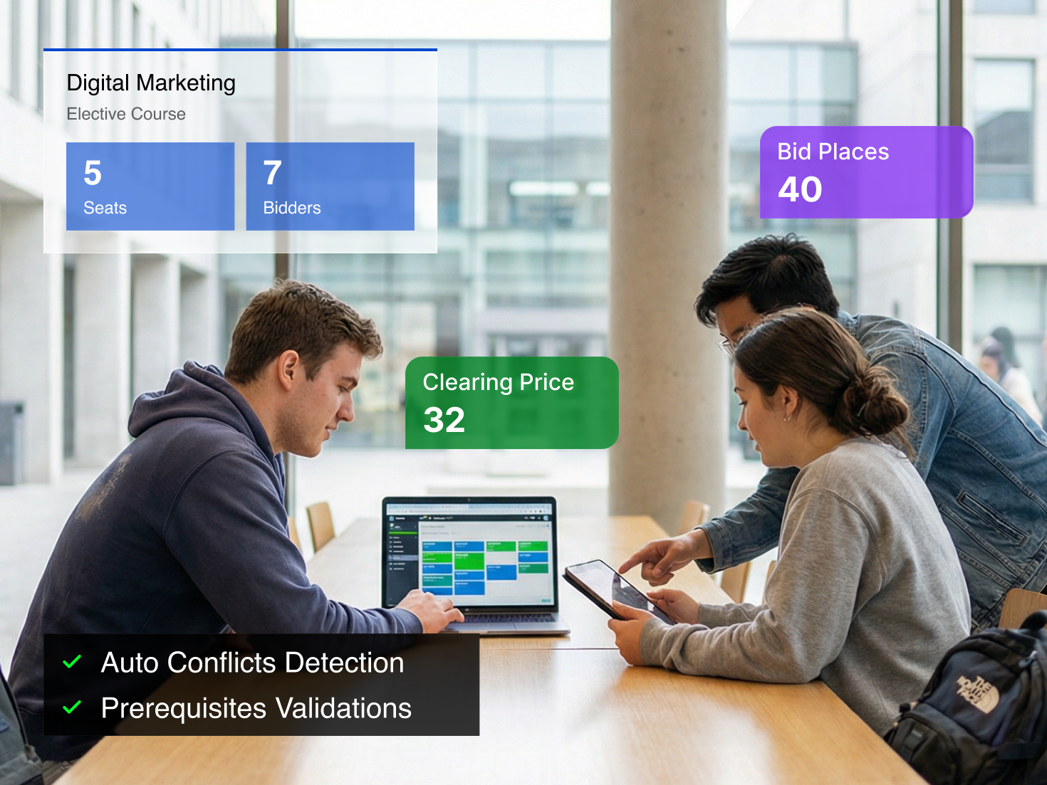 Replace chaotic first-come-first-served enrollment with a fair, transparent bidding system. Students bid on preferred courses using points — ensuring equitable access regardless of timezone.