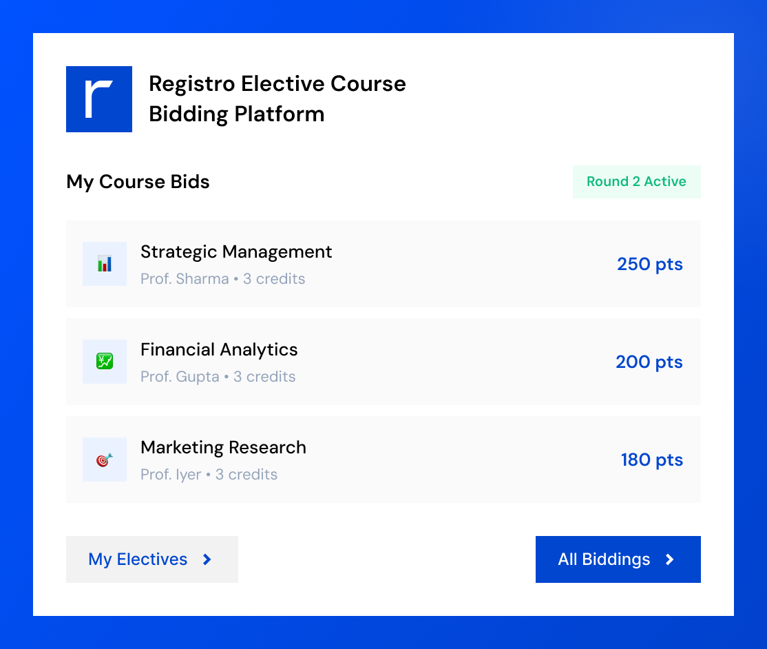 Yes, the Registro Course Bidding Software Platform allows you to track the status of your bids in real-time in case your college opts for a Real-Time Open Bidding Process workflow for course enrollments. In the Open Bidding rounds, you can see which courses you have secured in Real Time, Update bids as required to maintain winning states, and get complete insights on winning courses in the confirmation rounds.
