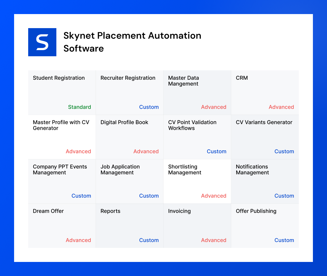 The Skynet Placement Automation software provides detailed reports and analytics on placement statistics, employer engagement, and student performance, with the scope fo custom reports, helping administrators make informed decisions.